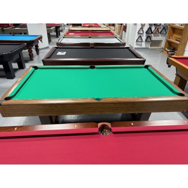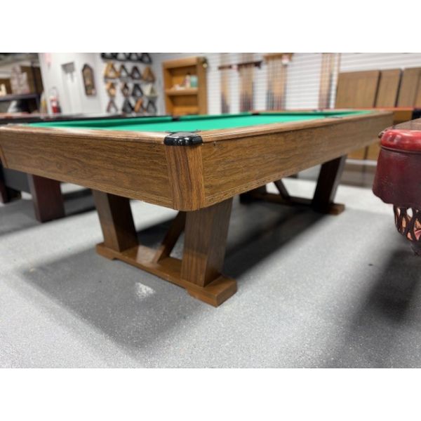 Made of engineered woods with very resistant Arborite simulated wood Dark Brown finish, pedestal style legs, natural quarried 1 inch slate, inset pockets and green billiard cloth. Includes a one year warranty and a used billiard accessory kit.