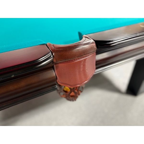 Made with hardwood and engineered woods, genuine leather pockets with brand new Championship Invitational Teflon stain protected Green billiard cloth.
