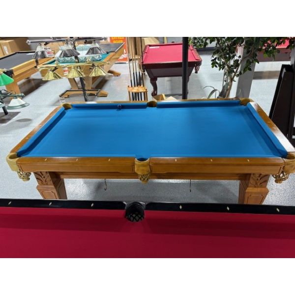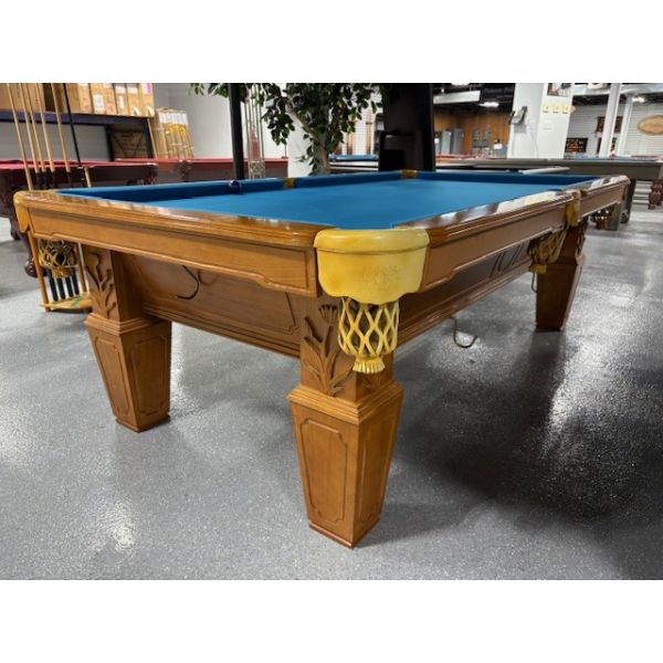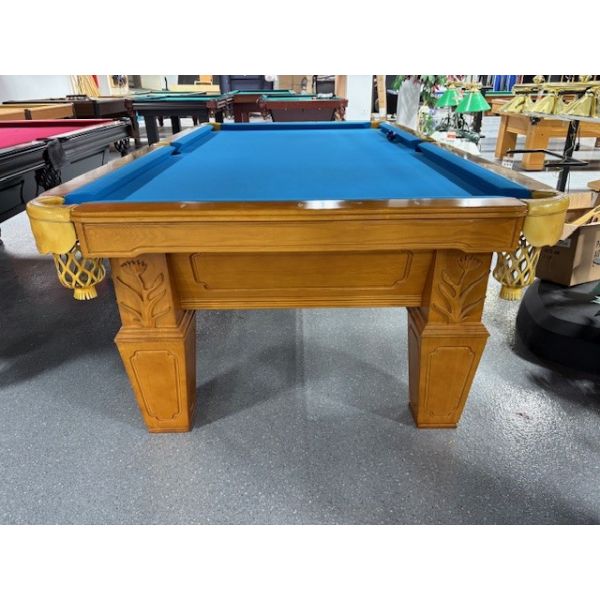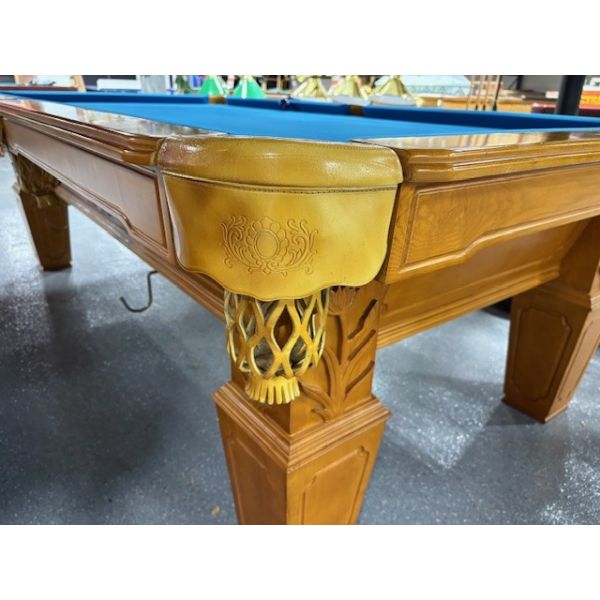 Medium Oak finish 8 foot natural quarried 1 inch slate used pool table with carved wood relief accents Code: TABLE548NN8