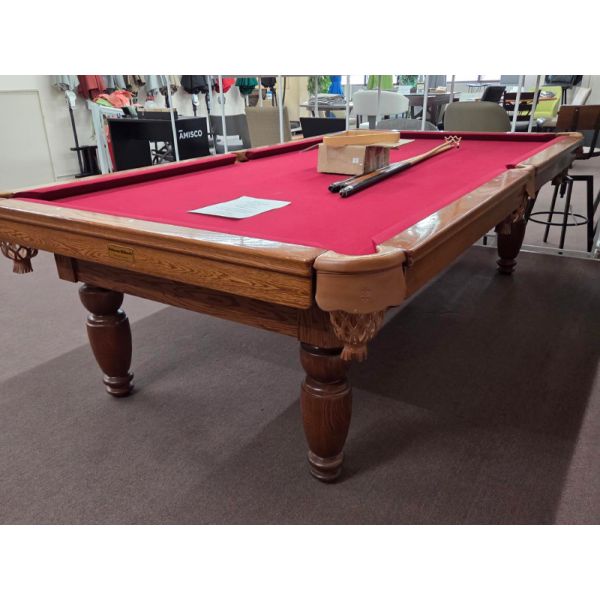 Made with solid Canadian White Oak and natural Oak Veneer engineered woods in Moka Brown finish, natural quarried 1 inch slate, genuine leather pockets and a Championship Invitational Teflon protected Burgundy felt billiard cloth. Includes a one year warranty and a used billiard accessory kit.
