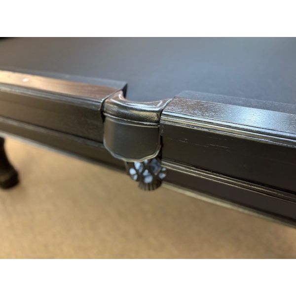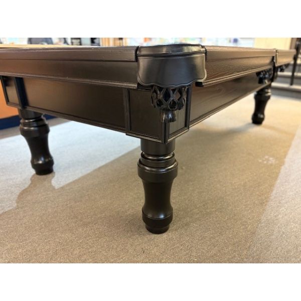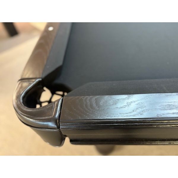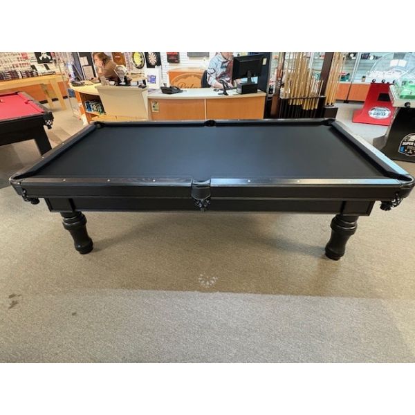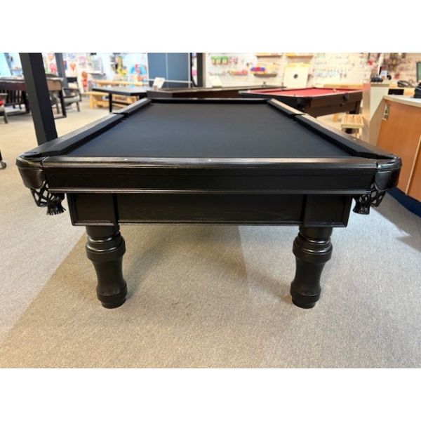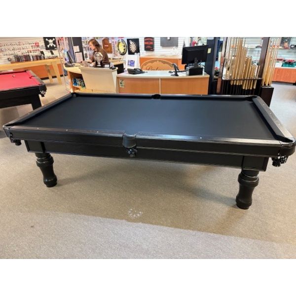 Used Beringer 9 foot pool table made of solid hardwood and natural quarried 1 inch slate Code: TABLE526BER9P Features turned legs and a brand new Andy 600T Club fast professional style Black stain protected billiard cloth. Includes a one year warranty and a used billiard accessory kit.