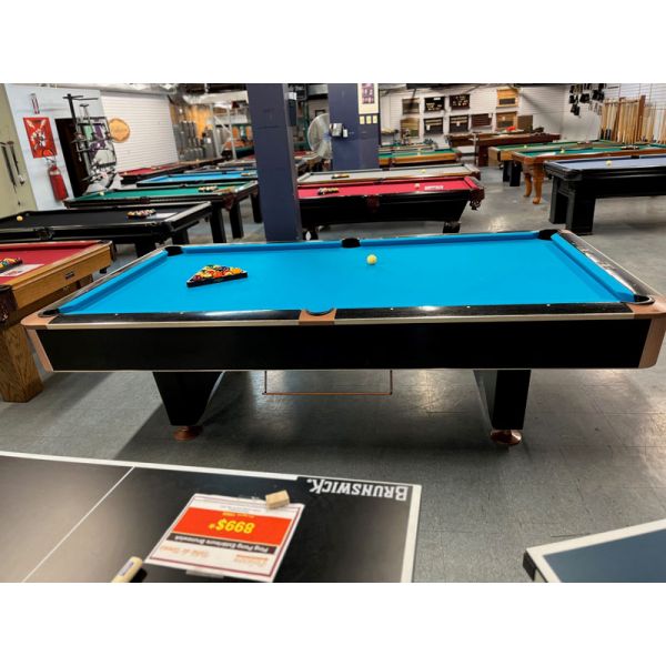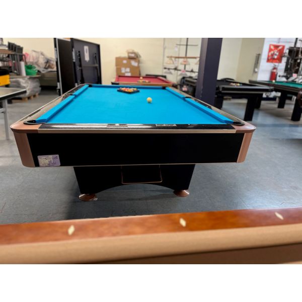 Canada Billiard competition style 9 foot used slate pool table Code : TABLE468CBB9P Made in Canada with solid hardwoods and engineered woods, covered with durable Arborite finish. Includes a one year warranty, a used accessory kit and a Blue Championship Invitational brand billiard felt cloth. Available at ; Palason Games, Billiards and Decor 300 avenue St-Charles, Vaudreuil, Qc J7V 2L9 T : 450-218-9399