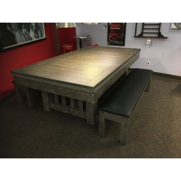 Made with North American and European hardwoods, leather genuine pockets and brand new Championship Invitational Teflon stain protected Black billiard cloth. Includes a 25 year warranty and a dining table top with some imperfections ( bench not included ). Several options of accessory kits are available and sold separately. Matching benches and dining top are also available and sold separately as options.
