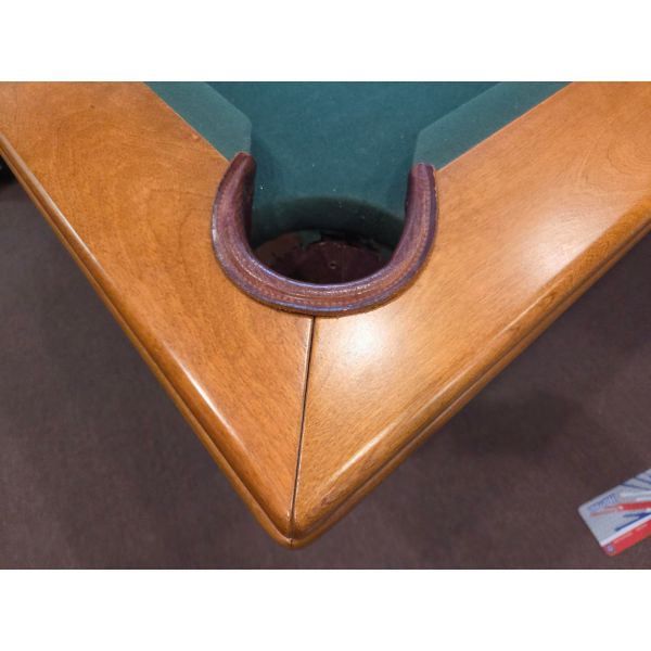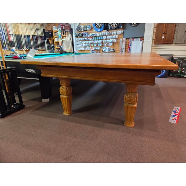 Versailles style carved leg 8 foot slate pool table with matching Dining/Conference table top. Made in the USA with Honey coloured finish hardwood and engineered woods, highly detailed carved wood legs and inset genuine leather drop pockets. Includes a one year warranty and a green pool table felt cloth.